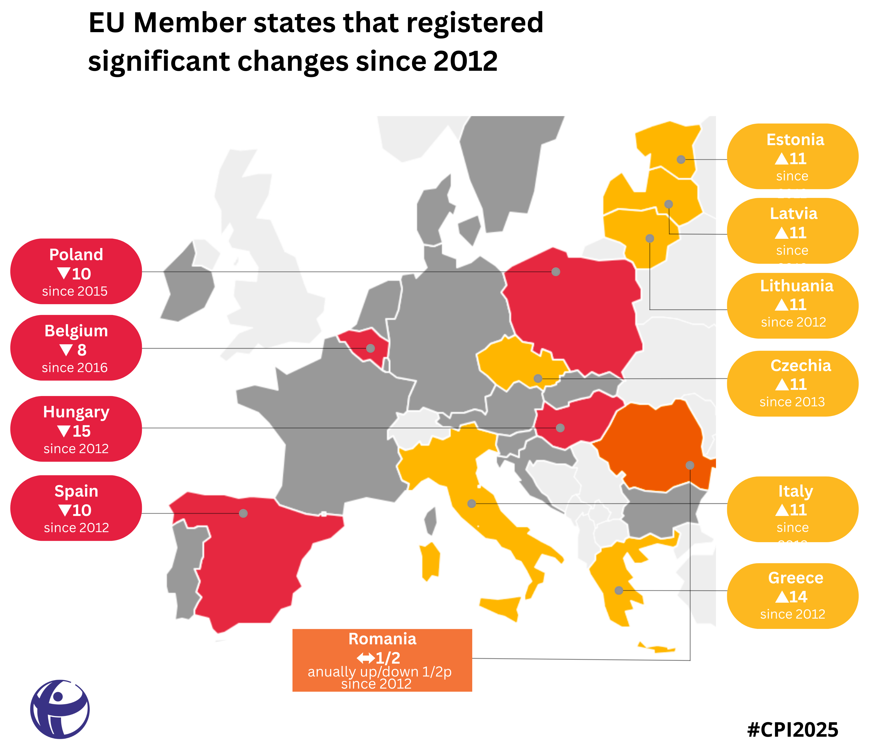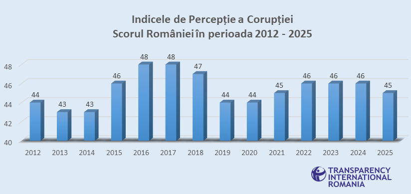 La nivel european, progresele anti-corupție stagnează de peste un deceniu, media UE fiind și în acest an de 62 de puncte. Cu 45 de puncte din 100 posibile în IPC 2025, România înregistrează de asemenea o stagnare, diferența față de 2012 fiind de doar un punct în plus. Cu un scor care a variat de la un an la altul cu 1 – 2 puncte, România rămâne printre ultimele trei state din UE în clasamentul IPC, alături de Bulgaria (40) și Ungaria (40).